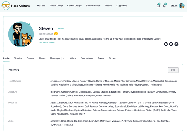 Start by creating your free profile and selecting your favorite Nerd Cultures (our name for interest tags that reflect your passions). Whether you’re into D&D, cosplay, Minecraft, basketball, coding, anime, crafting, or K-pop, adding your interests helps match you with like-minded members across the platform.