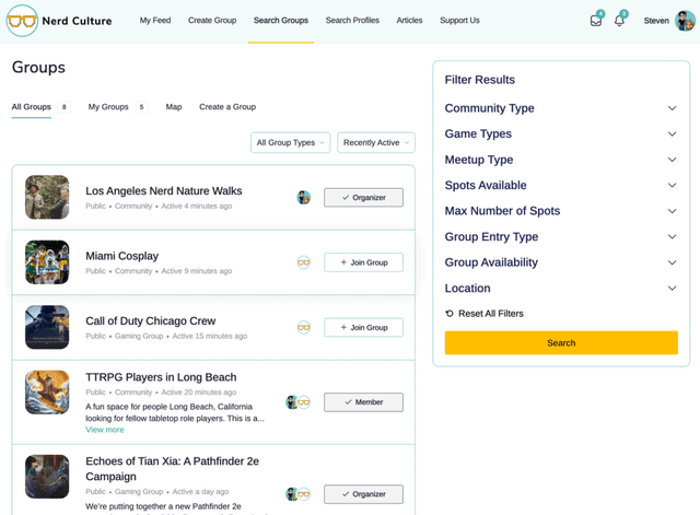 You can create themed or topic-based communities, gaming parties, hobby groups, book clubs, hacklabs, sport teams, and even event-based groups that are virtual or in-person. You can create or join as many groups as you have interests. We believe that everyone is a nerd for something, so it is important to us that we create a platform that has no limit to the types of groups and communities that can be created and hosted on Nerd Culture.