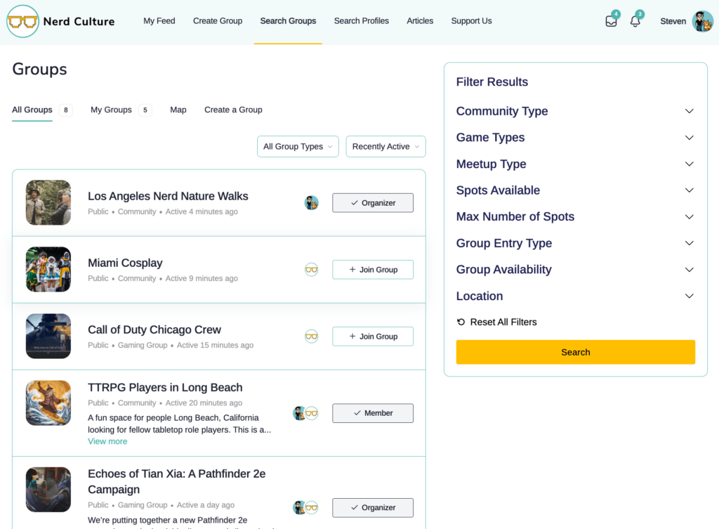 Explore communities built around your favorite activities using Nerd Culture’s group search feature. We’ve made it easy to meet real friends who understand you.